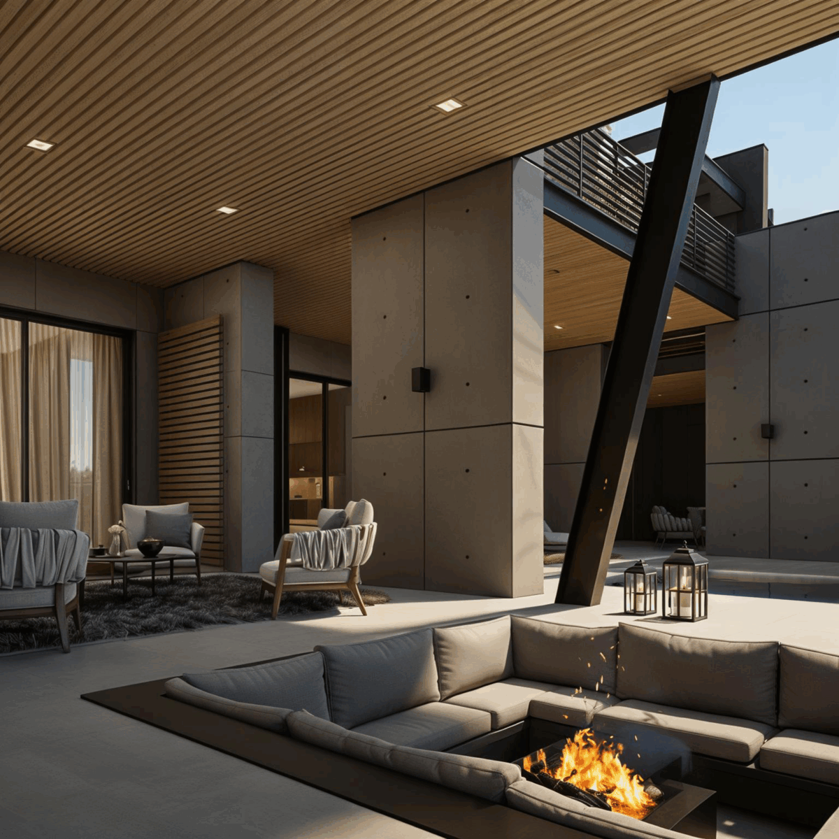 The spatial organization of the home is articulated by a series of tall stone and exposed concrete walls, which define the architectural rhythm and serve as both structural and expressive elements of the design.