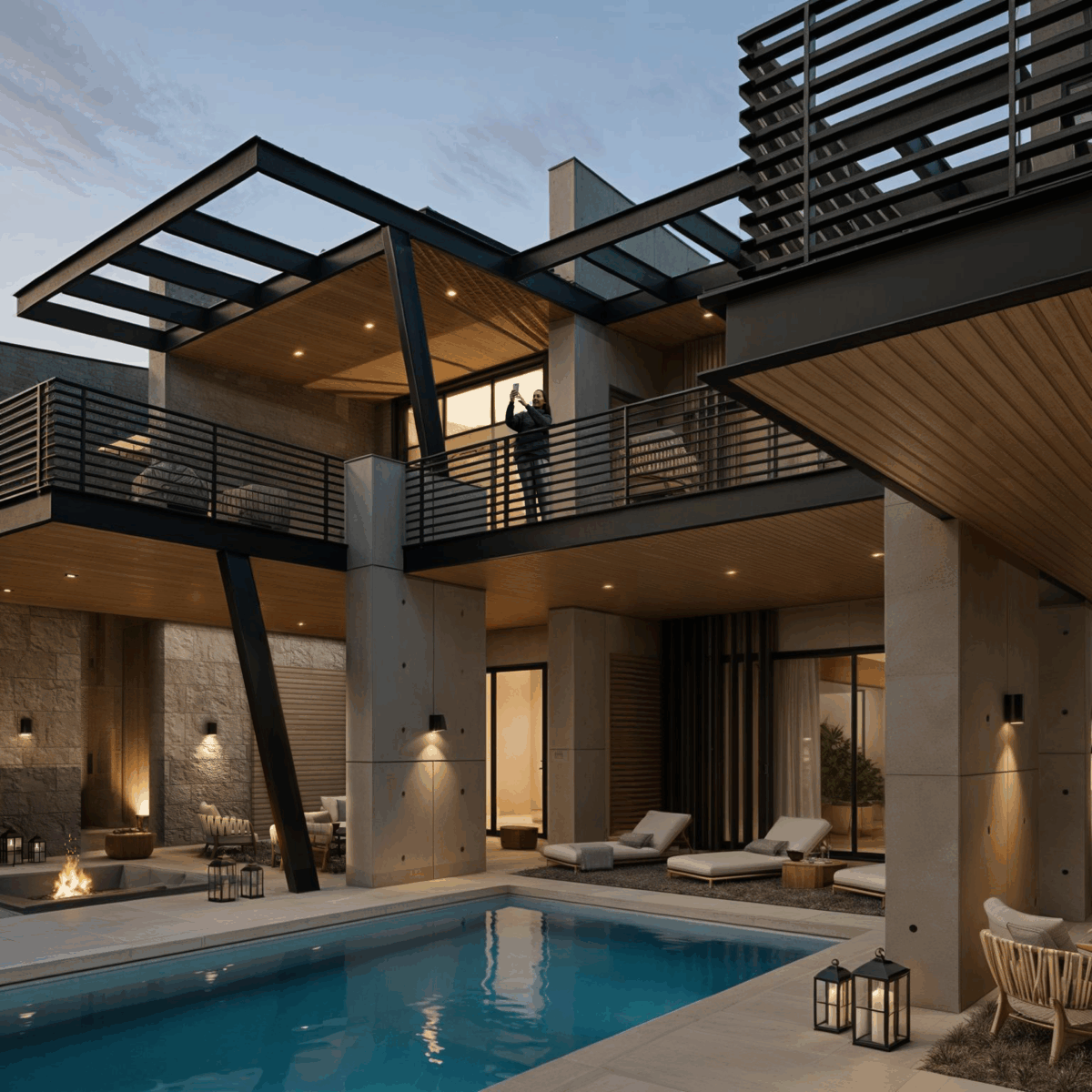 The two-story structure is terraced into the natural topography: the entry façade on the north presents as a single story, while the southern elevation extends to two stories, taking full advantage of the site’s incline. This south-facing façade features a generous stone-clad porch with outdoor amenities, including a swimming pool, fire pit, and expansive glass walls that allow abundant natural light to flood the double-height interior spaces.