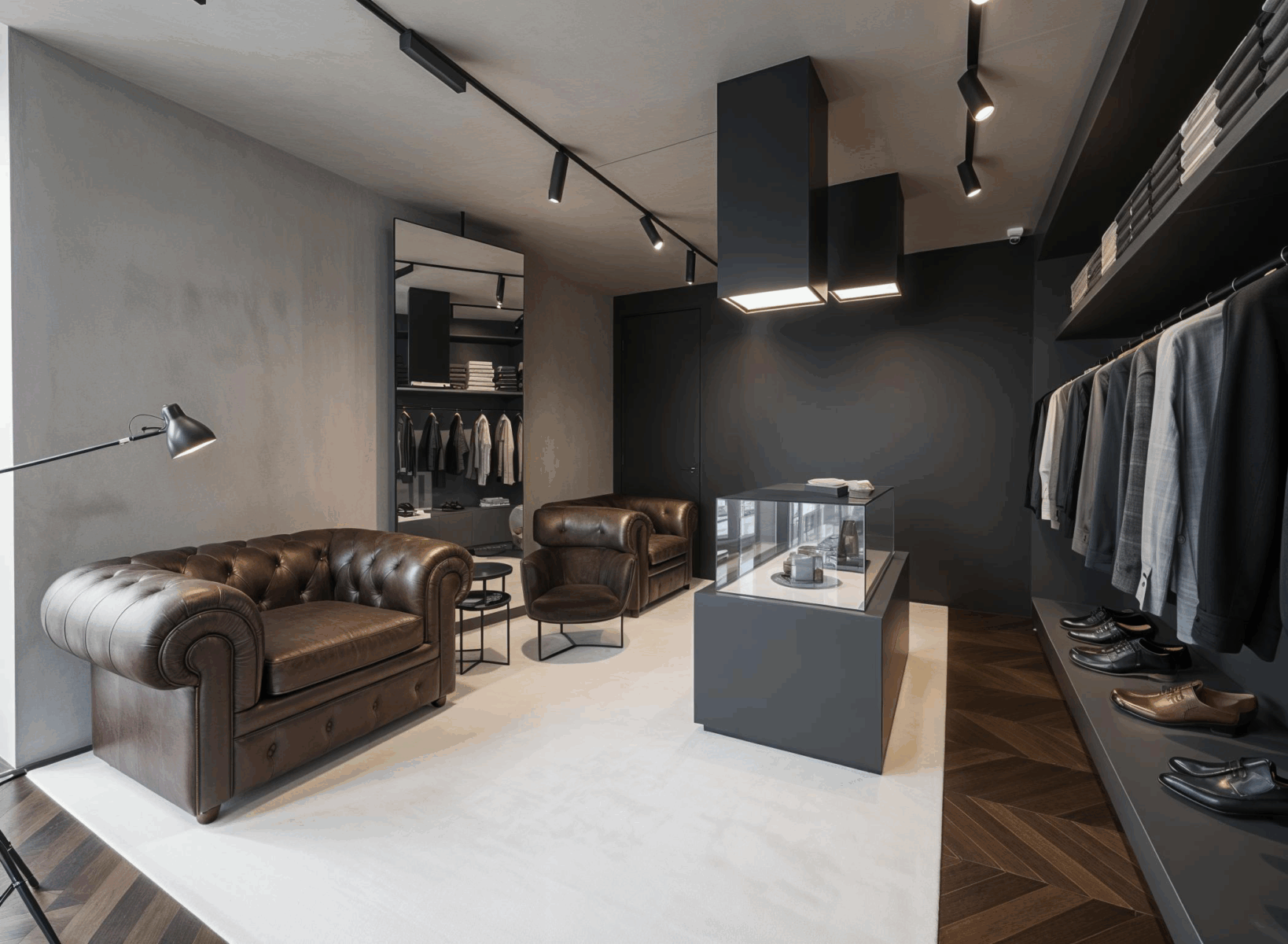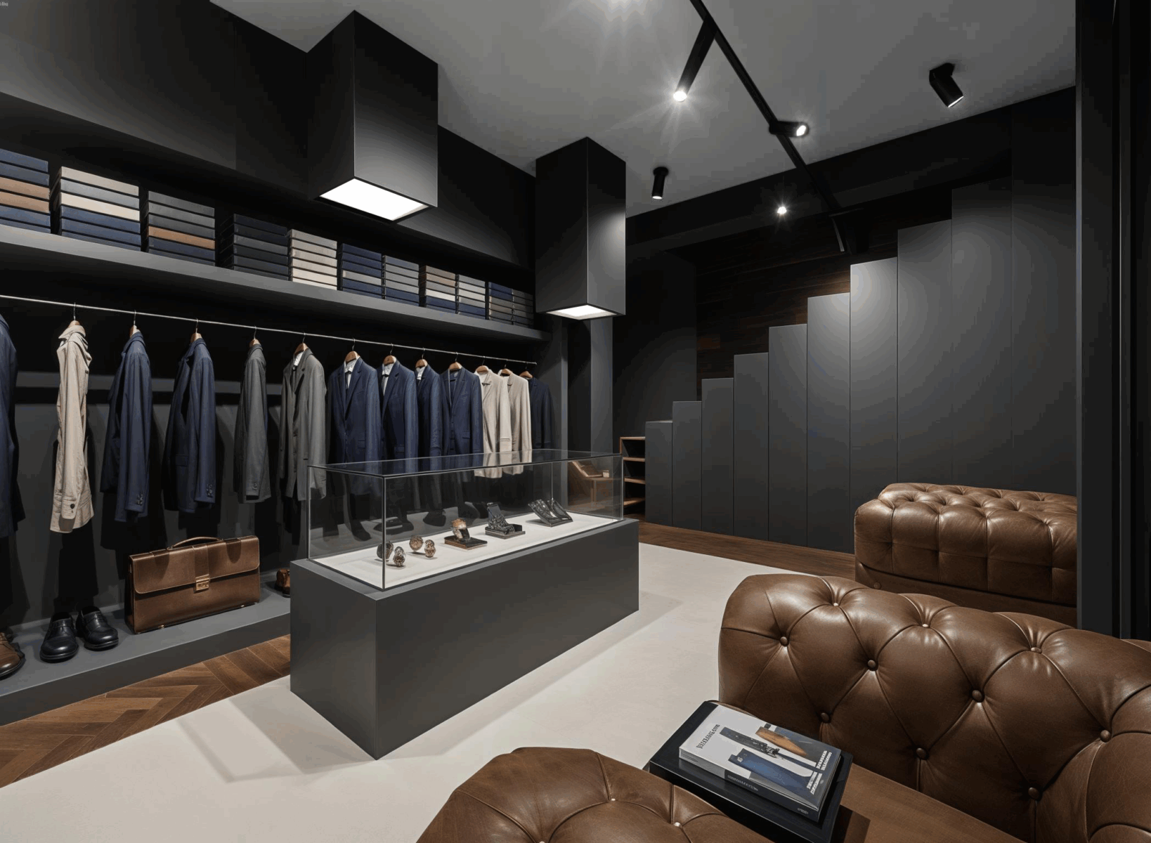 The long sides of the store hosts fixed exhibitors and clothes racks, each wooden shelf hosts a LED light that highlights the underlying clothes.