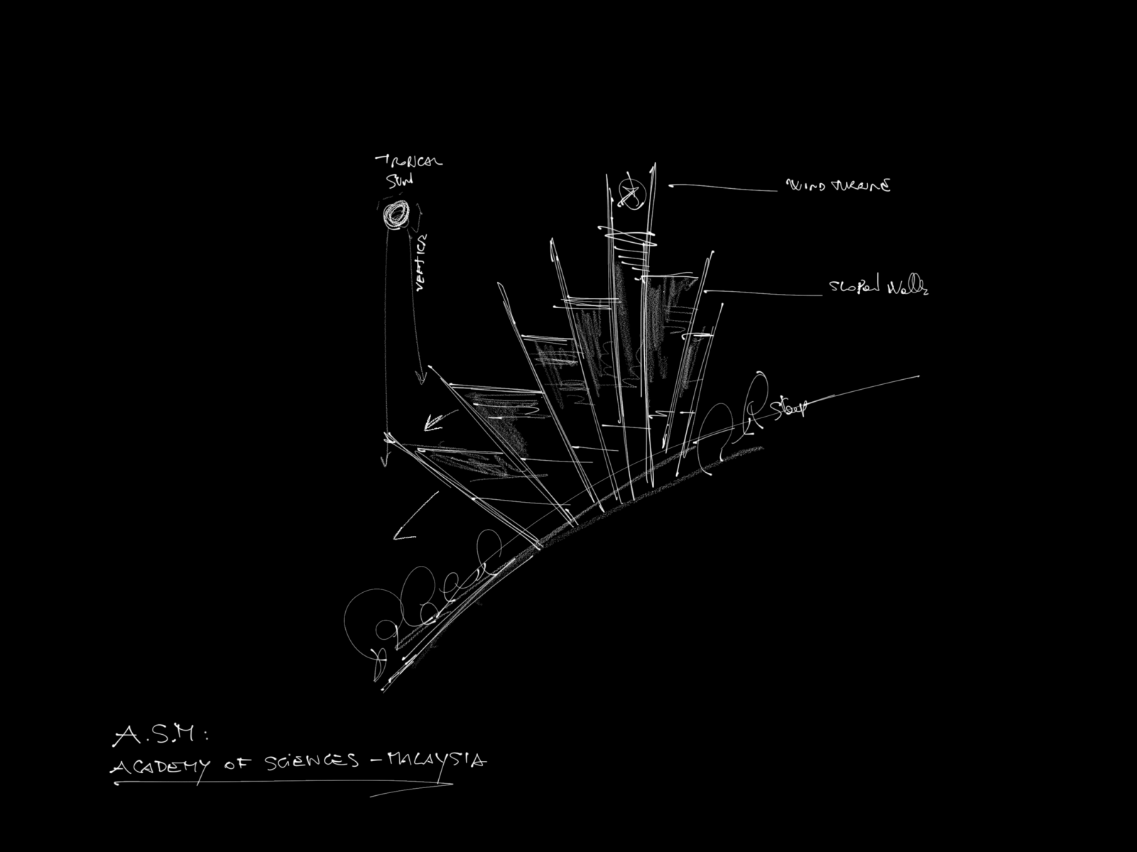 E’ proprio la luce naturale a modellare e inclinare i piani verticali secondo il percorso del sole. Con il loro movimento le superfici la riflettono, portandola all’interno della corte centrale per illuminare gli spazi e il verde; la respingono, nei punti maggiormente irraggiati; la captano, attraverso pannelli fotovoltaici. Tutto è basato sulla precisa volontà di preservazione dell’energia e delle risorse, legato indissolubilmente alla natura e ai suoi principi, aspirando ad una nuova architettura vernacolare. Alcuni serbatoi raccolgono l’acqua piovana per alimentare le piscine e turbine eoliche generano energia elettrica sufficiente all’Accademia. I terrazzi e gli spazi verdi, contribuiscono, attraverso la loro strategica posizione, alla creazione del microclima ideale, studiato in dettaglio in sezione dal basamento all’apice dell’edificio. In due parole è un’architettura “LEED Platinum”. Si colloca perfettamente nel contesto senza stravolgerlo né alterarne gli equilibri naturali, ma coesistendo con esso e i suoi principi generatori, dialogando come un fiore con la terra. La luce attraversa gli spazi creando voluti effetti emozionali e giochi di riflessi, arrivando “dove serve” e nella quantità “giusta”. L’Accademia delle Scienze risulta essere una perfetta sintesi tra bioarchitettura, simbolismo poetico e autoctono e high-tec.