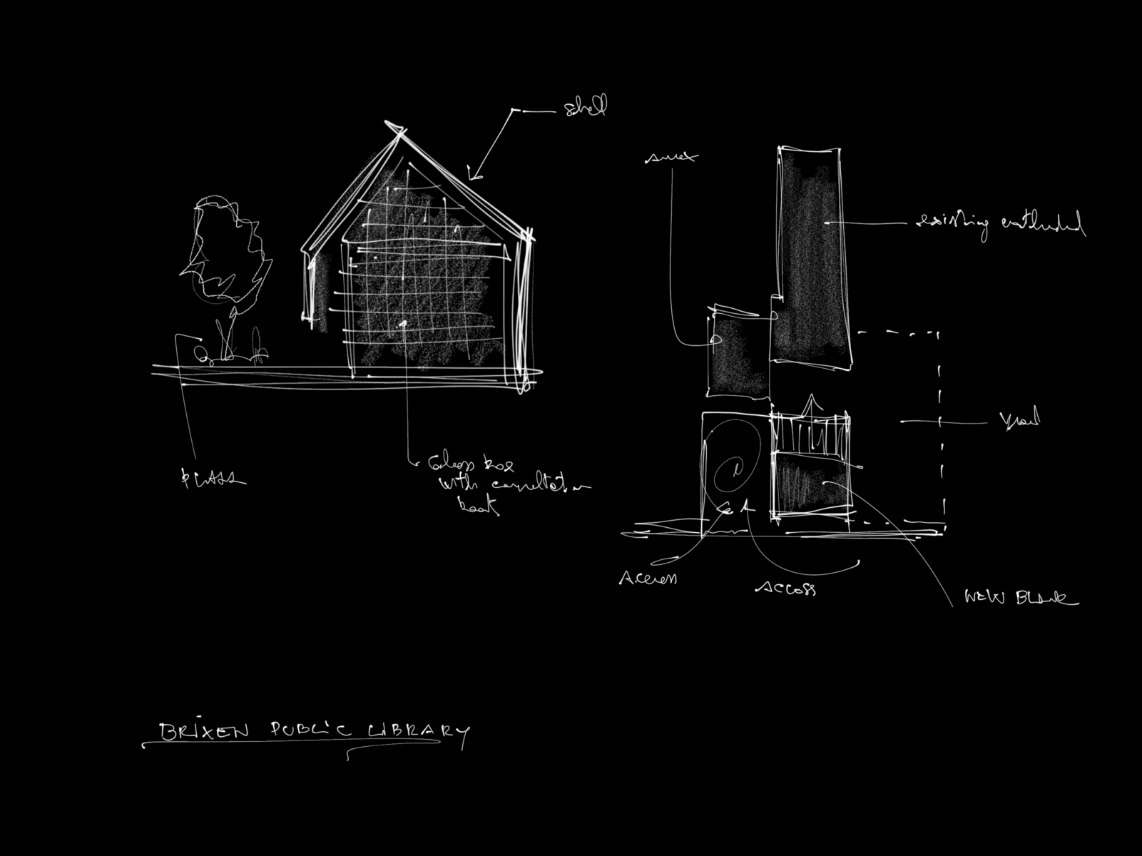 La volumetria destinata alla disposizione dei libri è concentrata in un unico volume a tutt’altezza che diviene il “cuore” della biblioteca. Attorno a questo volume si costruisce l’edificio che ne riprende la forma e si fa semplice involucro di chiusura e protezione. Tale involucro trasparente subisce due operazioni formali: in primo luogo viene avvolto da un guscio opaco che protegge la collezione dei libri dalla radiazione solare e modera la luminosità interna; successivamente esso viene fatto scorrere fino ad accostarsi ai palazzi del Tribunale e della ex caserma.
