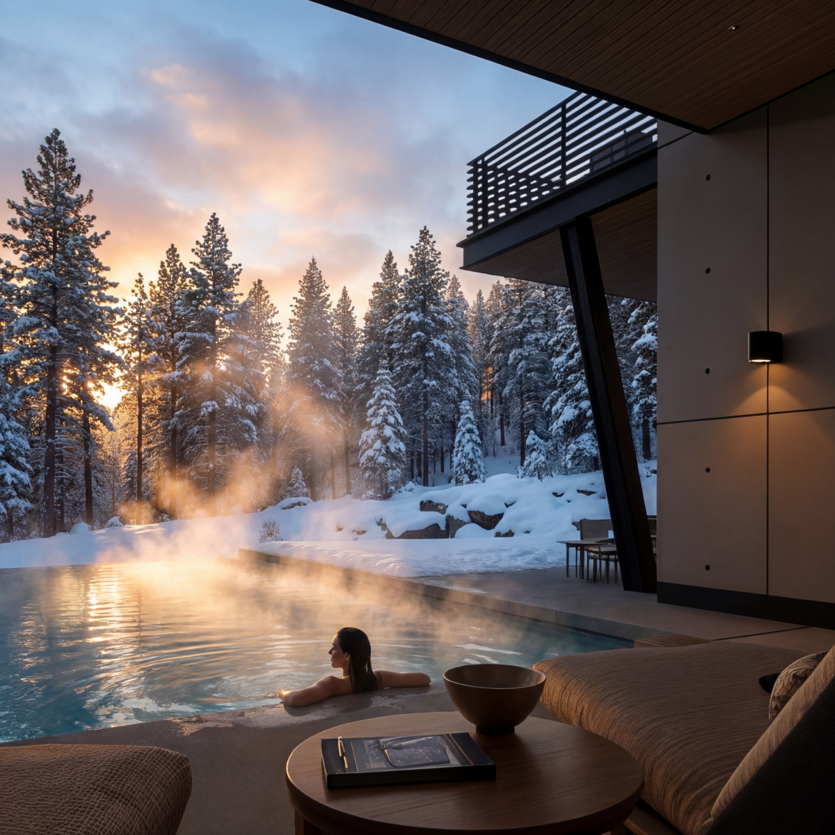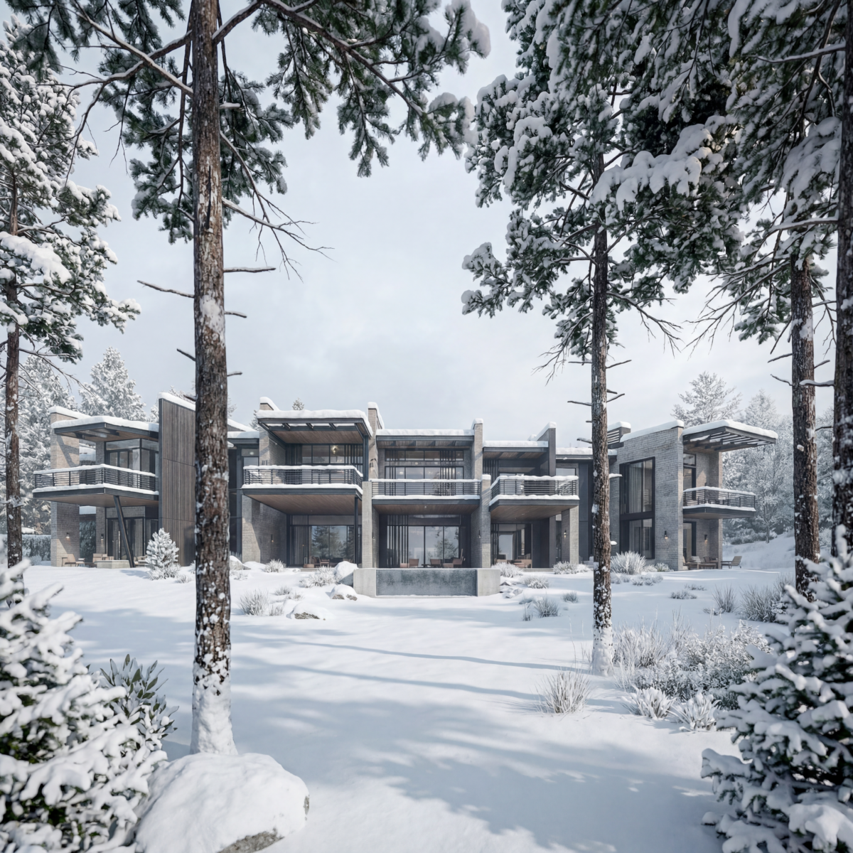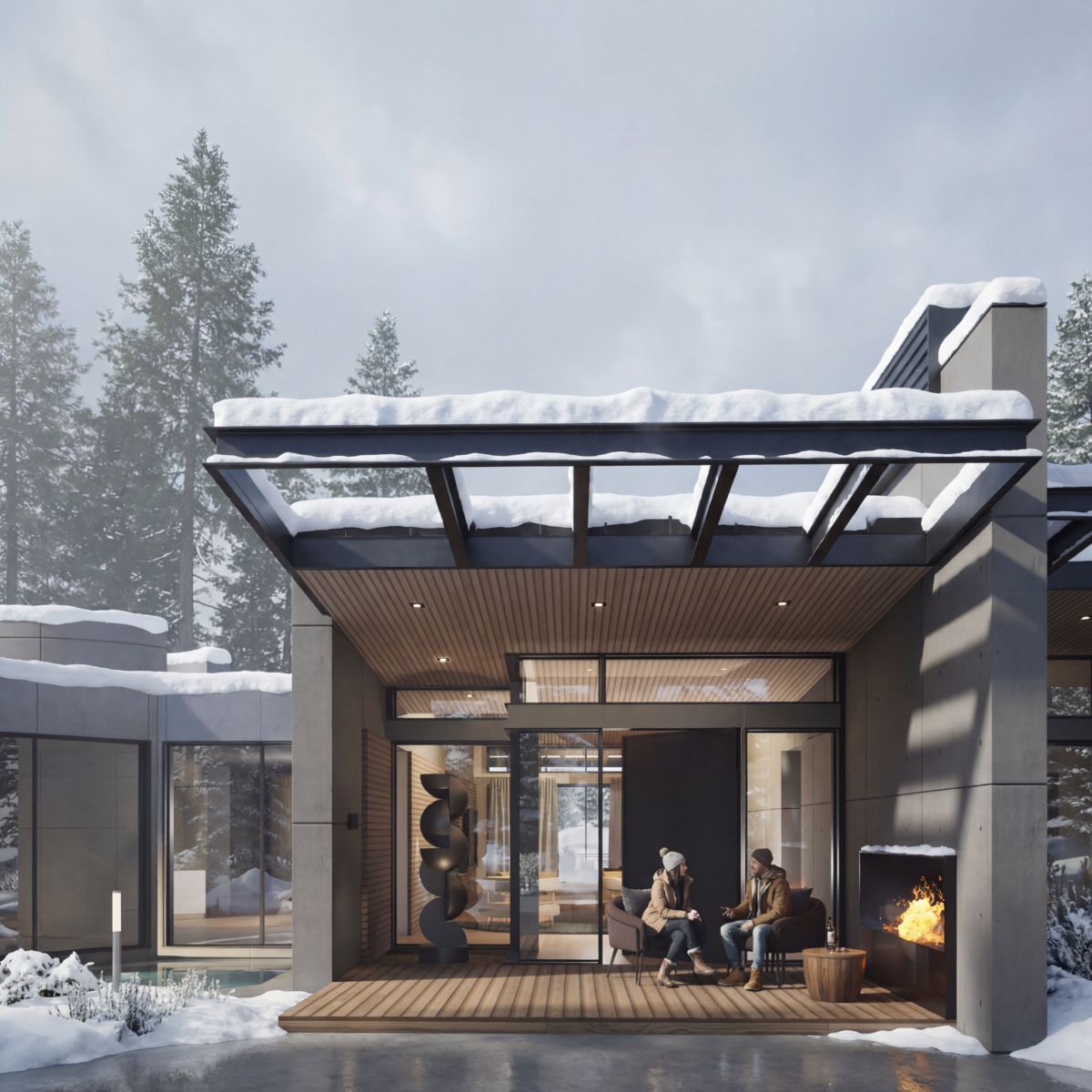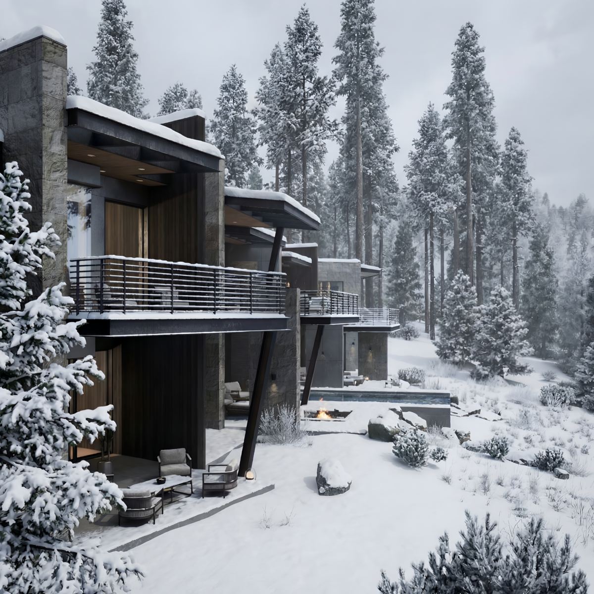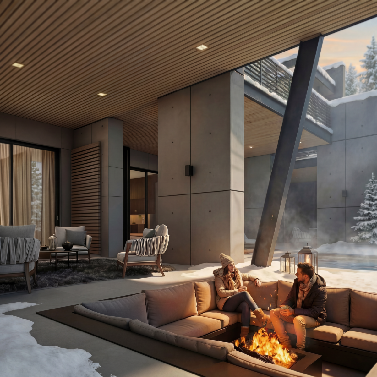 L’impianto architettonico è stato concepito per massimizzare le viste panoramiche in ogni direzione: a sud si apre sulla valle, mentre a nord si affaccia sulle cime montuose circostanti. Il corpo centrale, che accoglie l’ingresso principale e una grande sala a doppia altezza, è circondato da quattro volumi secondari, ognuno orientato in modo differente per inquadrare specifici elementi del paesaggio.