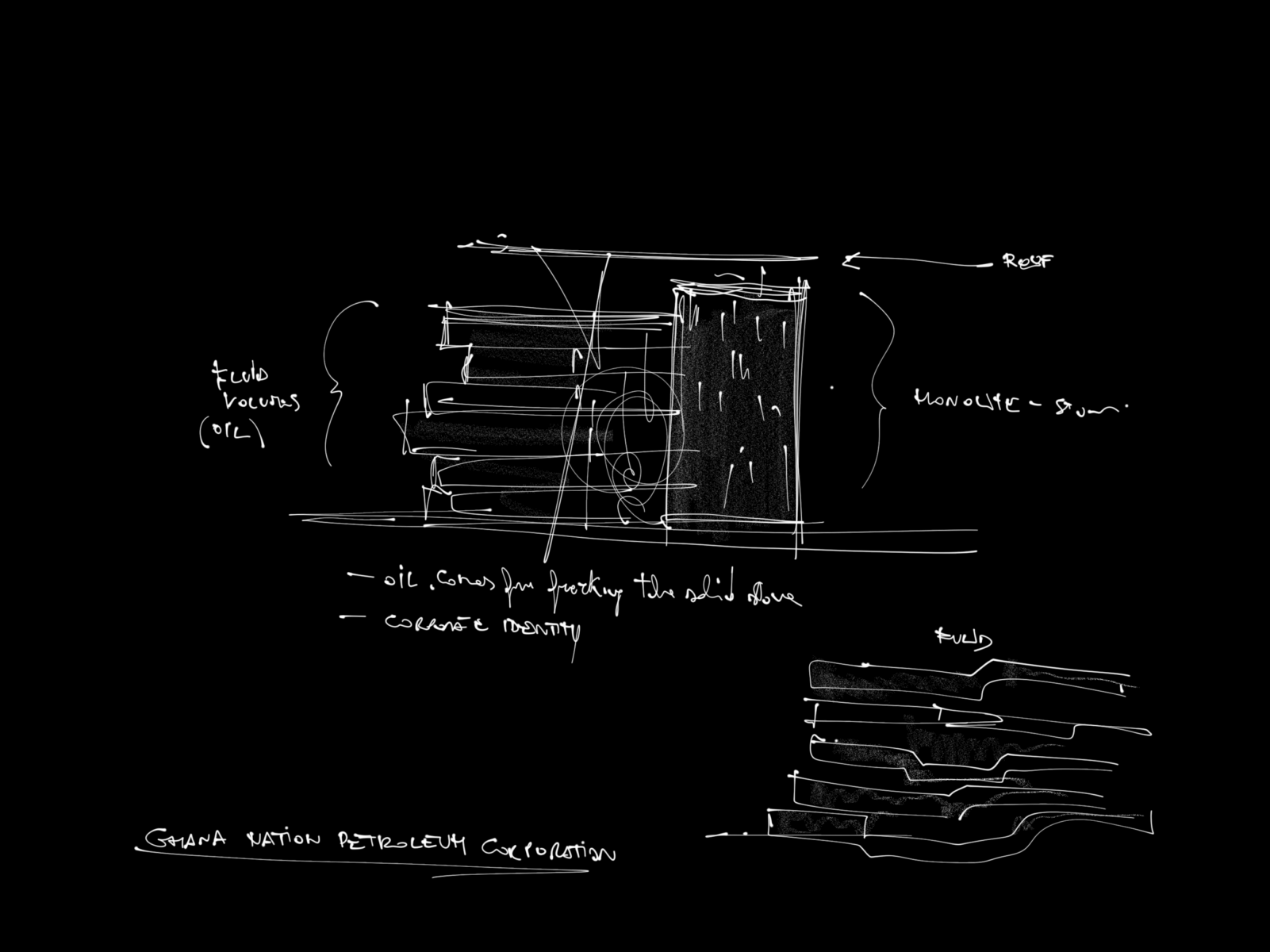 Il corpo dell’edificio è diviso in due blocchi separati che rappresentano la gerarchia funzionale della compagnia petrolifera, composta da un settore amministrativo e da uno operativo.